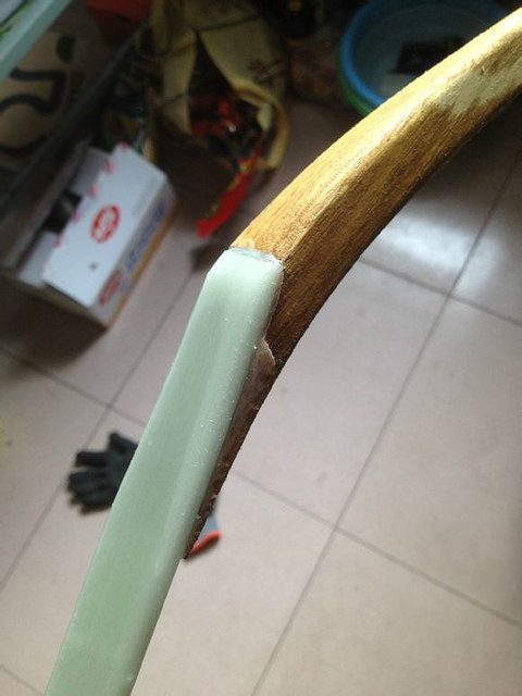 Use a cola para unir as peças de madeira da ponta do arco com a fibra de vidro, e em seguida, enrole-o firmemente por ataduras (elásticos) e fios. Depois espere 12 horas para a cola mostrar seu poder de colagem.</span >