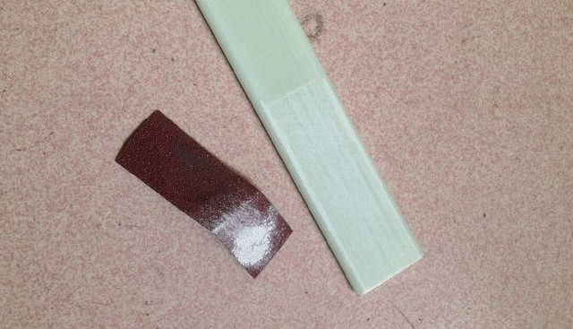 Na primeira rodada, use uma lixa 400 para lixar fora das bordas e cantos, especialmente no sulco de encaixe. </span >Na segunda rodada, utilize lixa 2000 para deixar as áreas de colagem (madeira e fibra de vidro) ásperas (a fim de colar mais firmemente). Ou use lixas de sua preferência.</span >