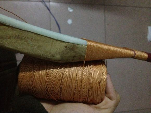 Use a cola para unir as peças de madeira da ponta do arco com a fibra de vidro, e em seguida, enrole-o firmemente por ataduras (elásticos) e fios. Depois espere 12 horas para a cola mostrar seu poder de colagem.</span >
