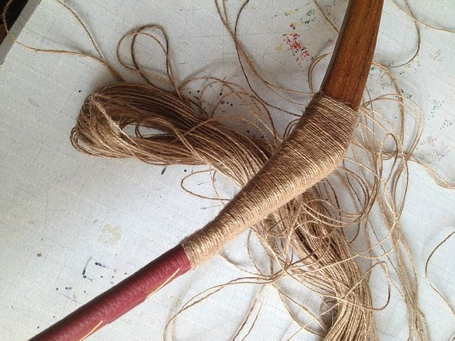 Enrole primeiro o couro, em seguida, enrole o nylon e entrelaçe (nylon para a fixação do couro, entrelaçar apenas para fazer o arco parecer mais tradicional).</span ></span >